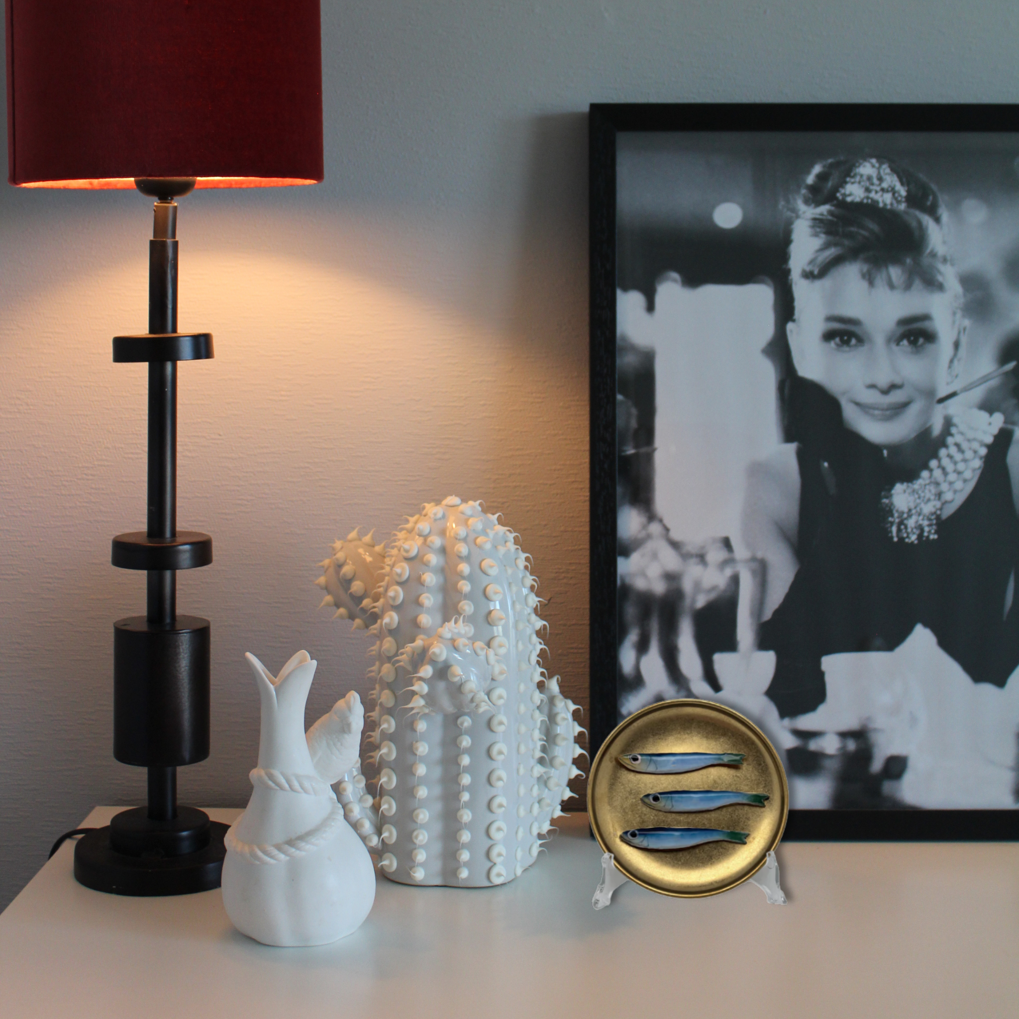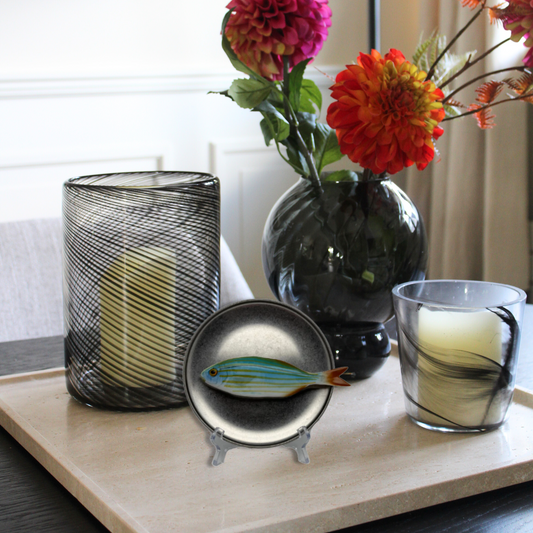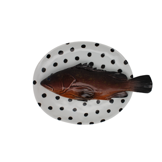 Cernia medio op een ovaal wit met zwarte stippen bord, 22X19 cm