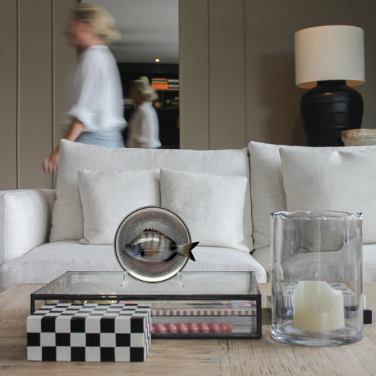 Sarago medio op donker bruin vintage bord, 16 cm rond