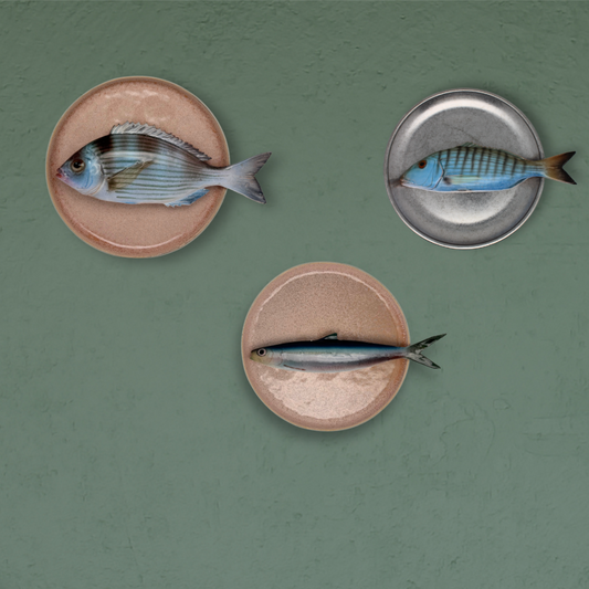 Spigola op roze vintage bord, 25 cm rond