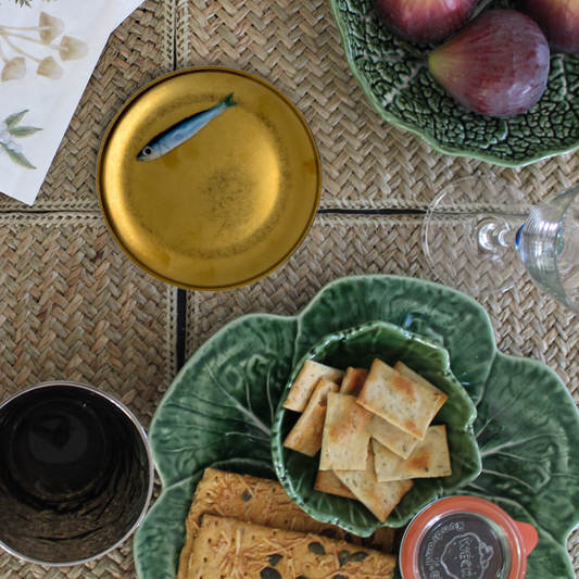 Serveerbordje antiek goud met sardine piccolo, 16,5cm rond