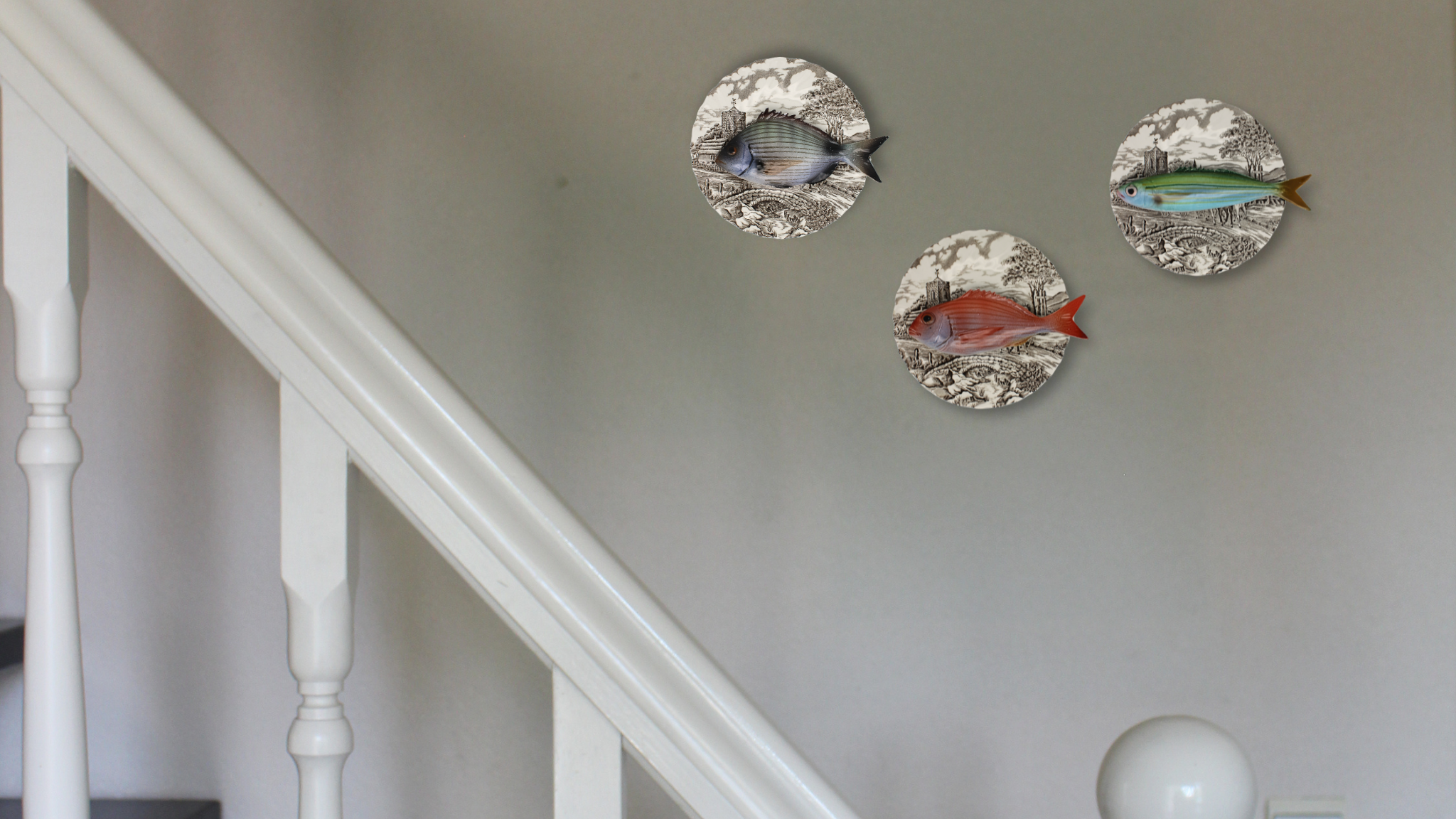 Sarago medio op donker bruin vintage bord, 16 cm rond
