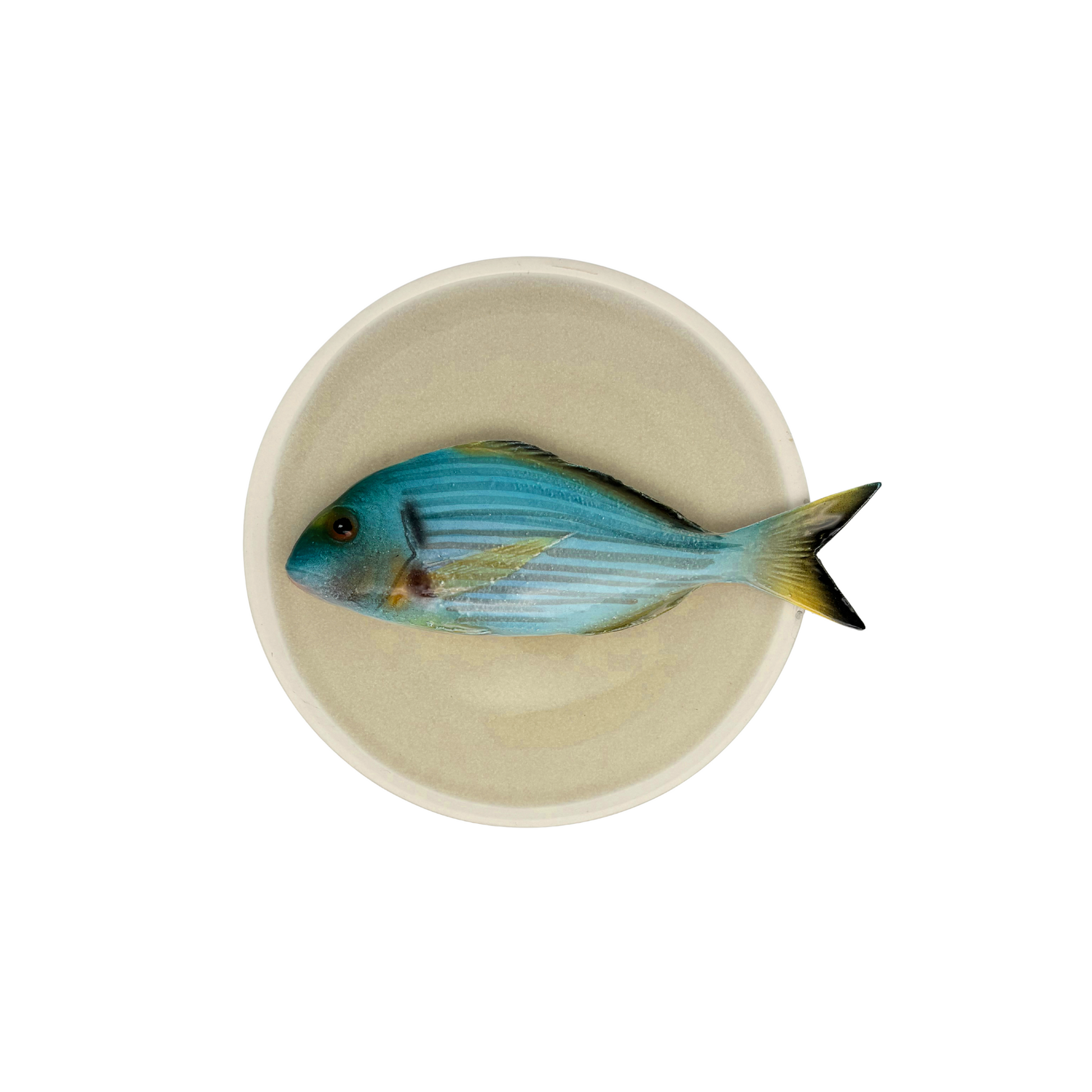 Orata medio op zandkleur bord met lichte rand, 20cm rond. Aan de achterkant is een ophanghaakje bevestigd en kan direct aan de wand gehangen worden.