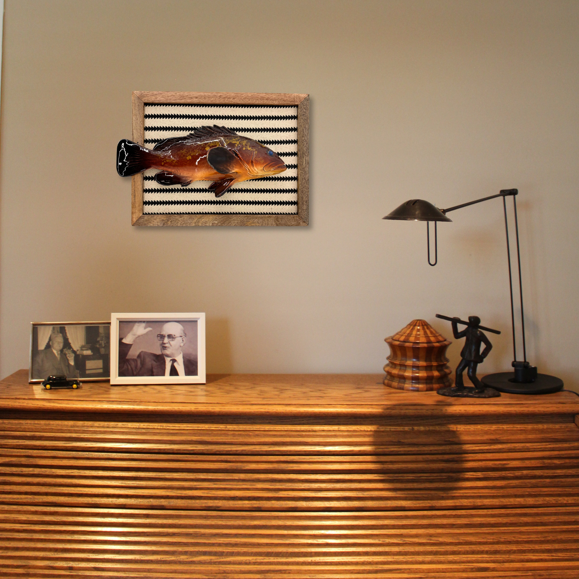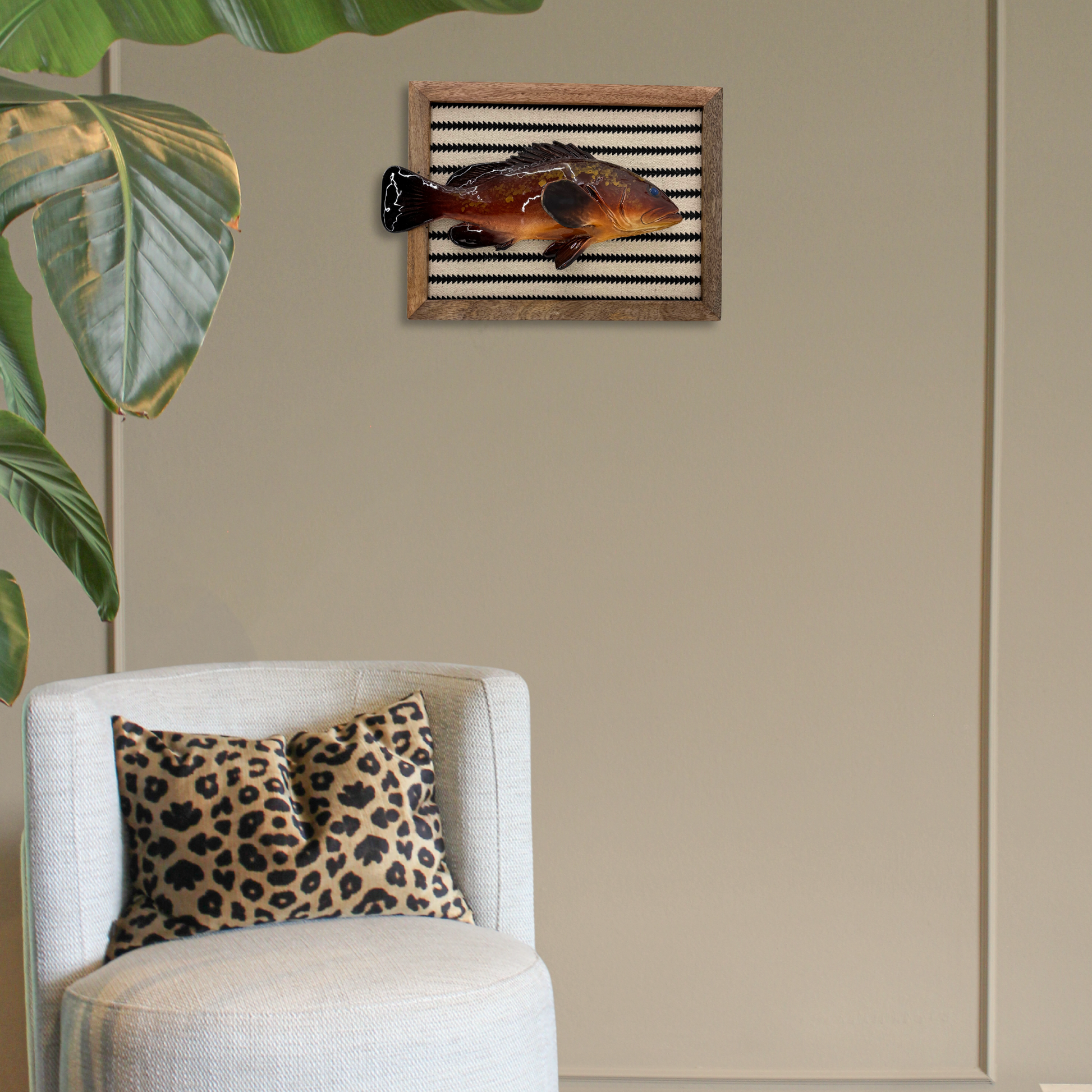 De Cernia multo grande is in een Mango houten lijst bevestigd met een gestreepte zwart en beige stof aan de achterkant. Ook nu steekt de staart van de vis over de rand heen.