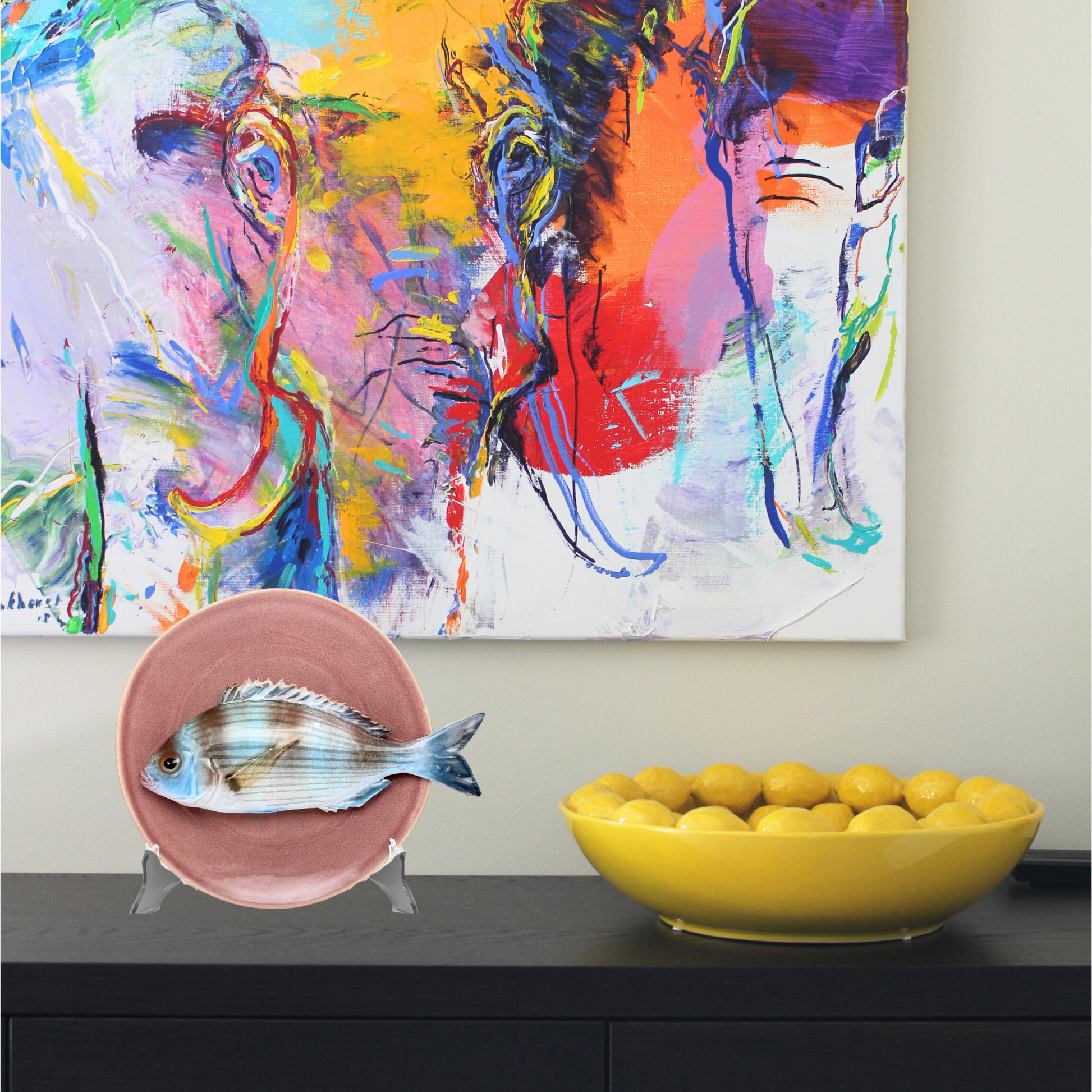 Tanuta op een lila/aubergine bord, 22 cm rond, aan de achterkant zit een ophanghaakje bevestigd en kan direct aan de wand gehangen worden.