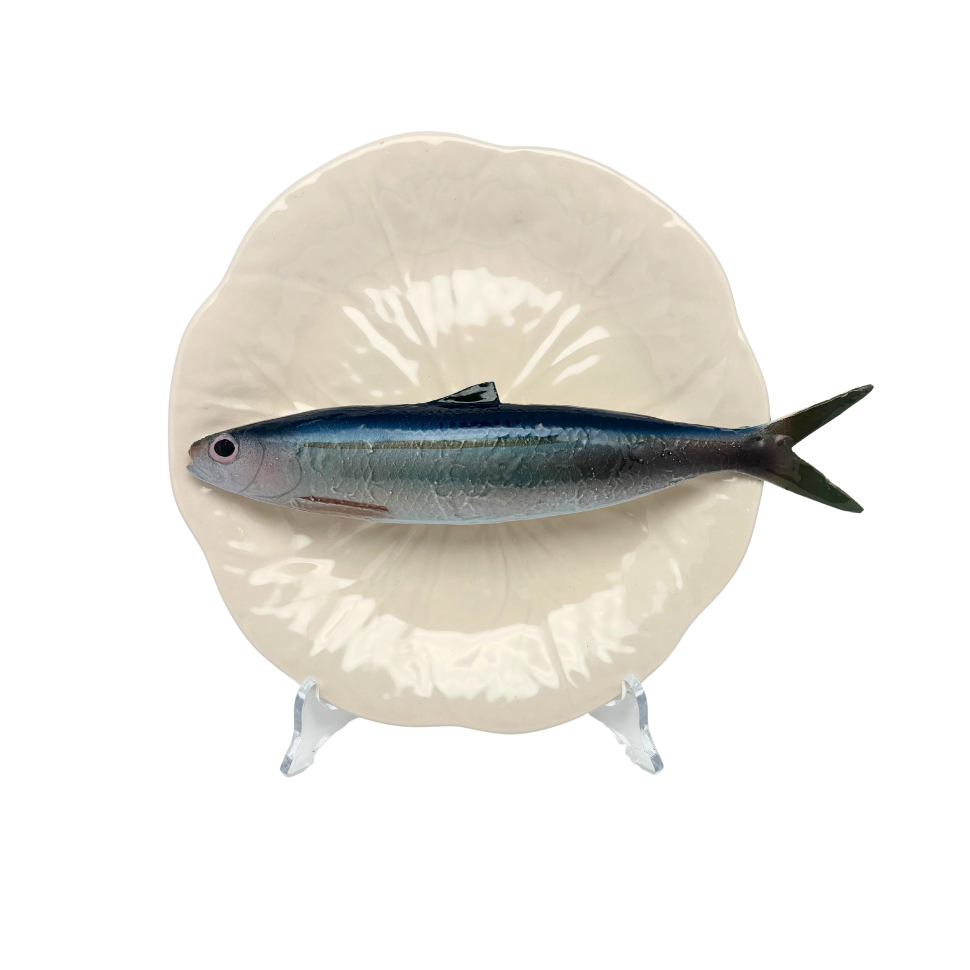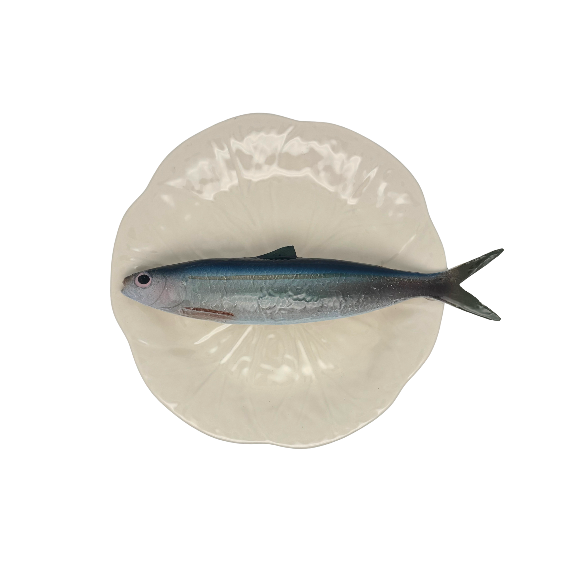 Alaccia/Haring op een créme bladvormig bord met lichte rand, 20 cm rond. Er zit een haakje aan de achterkant van het bord bevestigd en kan direct opgehangen worden.