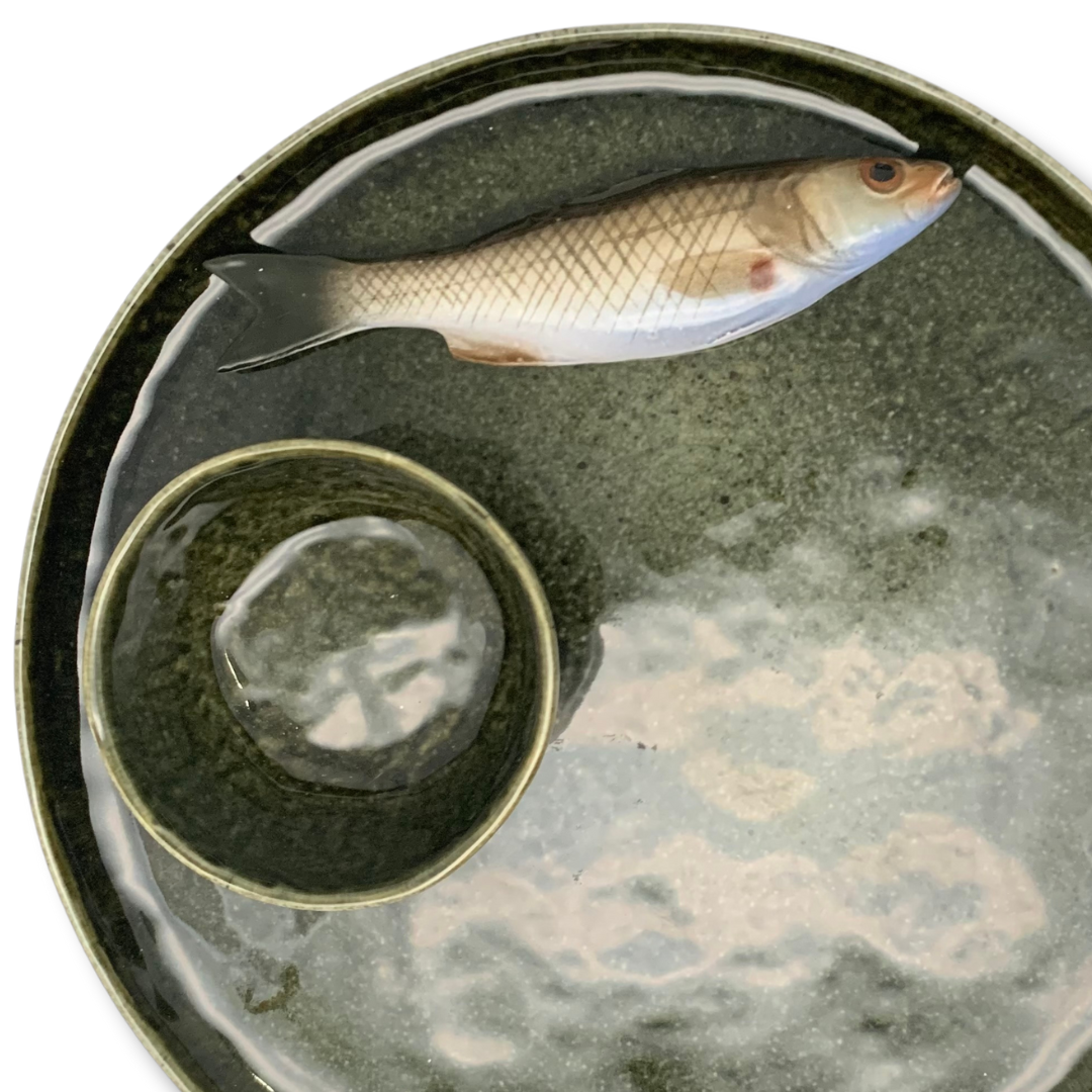 Borrelbord Spigola medio, inclusief dipbakje in donker groen. Bord is 27cm rond en het dipbakje is D9 X H4,5 cm. De vis Spigola en bakje zitten vast op het bord.