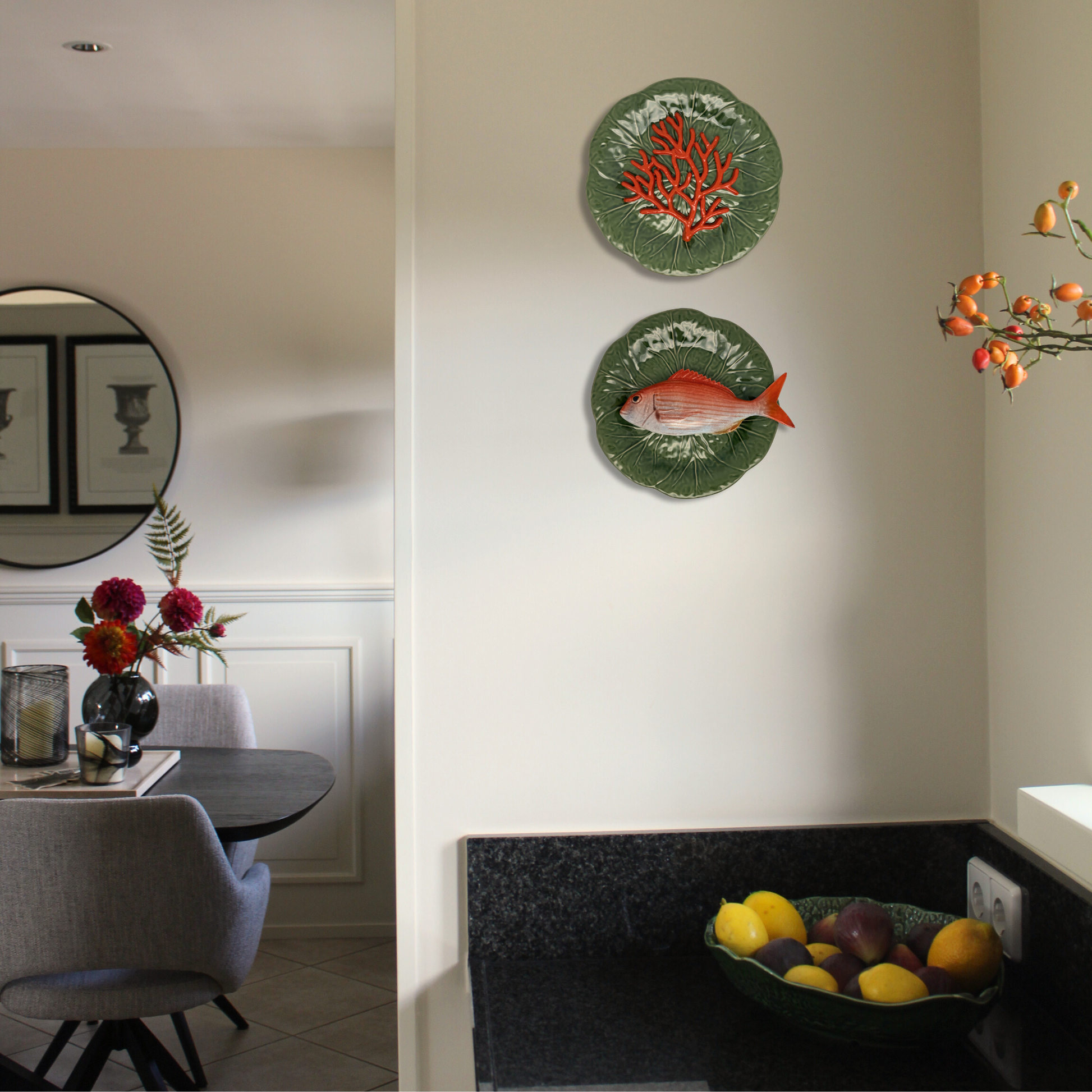 Pagro op een groen bladvormig bord, 27cm met aan de achterkant een ophanghaakje bevestigd en kan direct aan de wand gehangen worden.