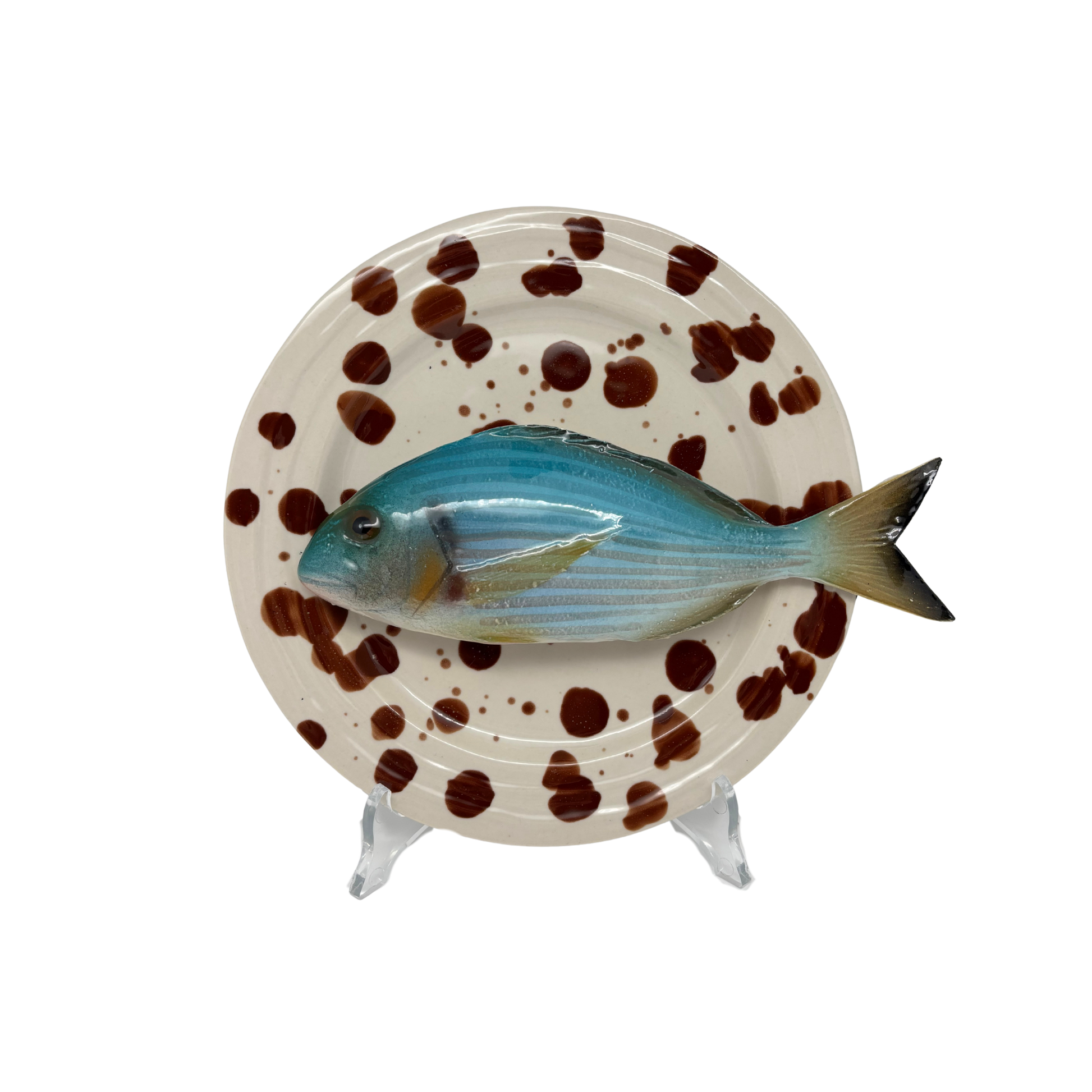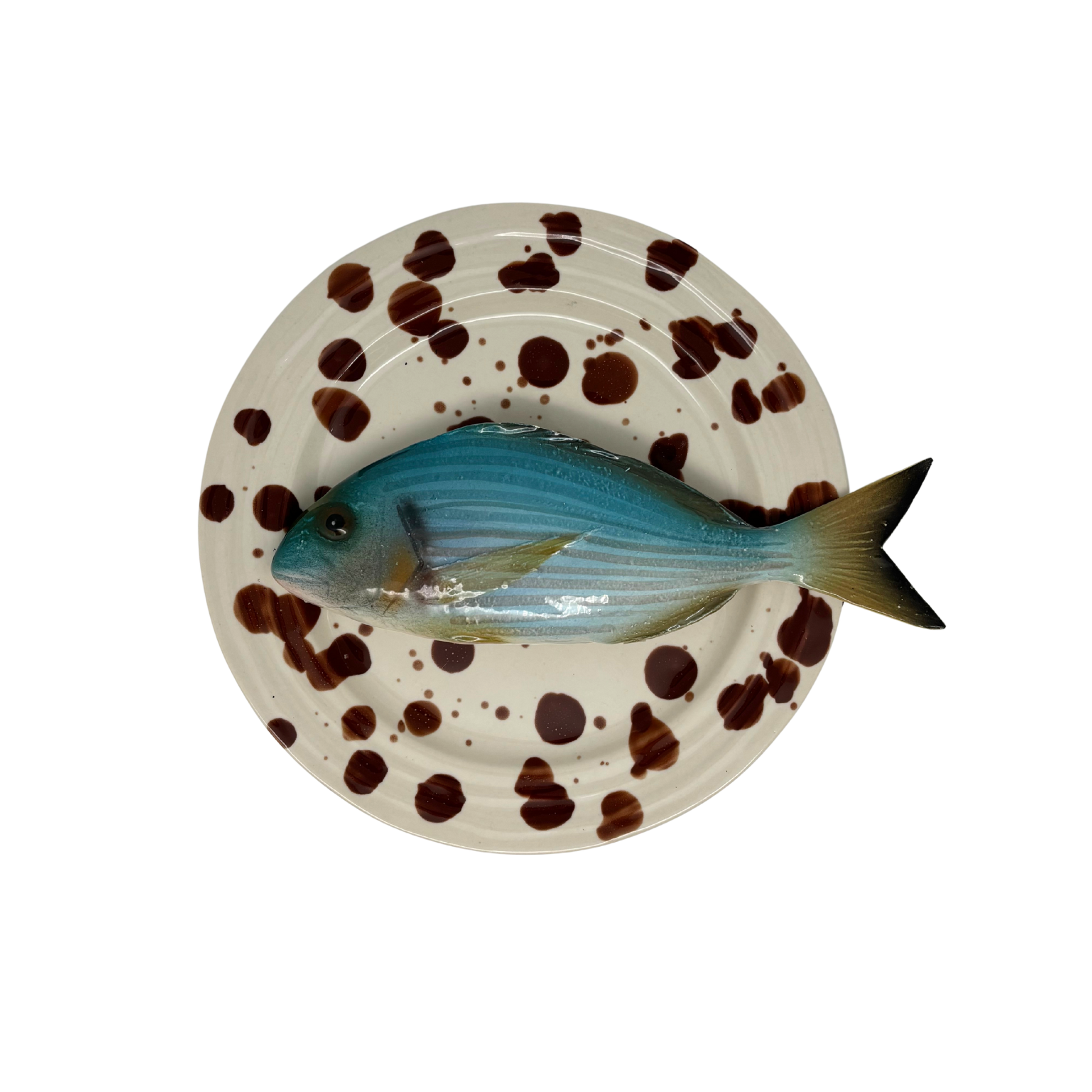 Orata medio op crème met bruine verfspatten bord, 20cm rond. Aan de achterkant is een ophanghaakje bevestigd en kan direct aan de wand gehangen worden.