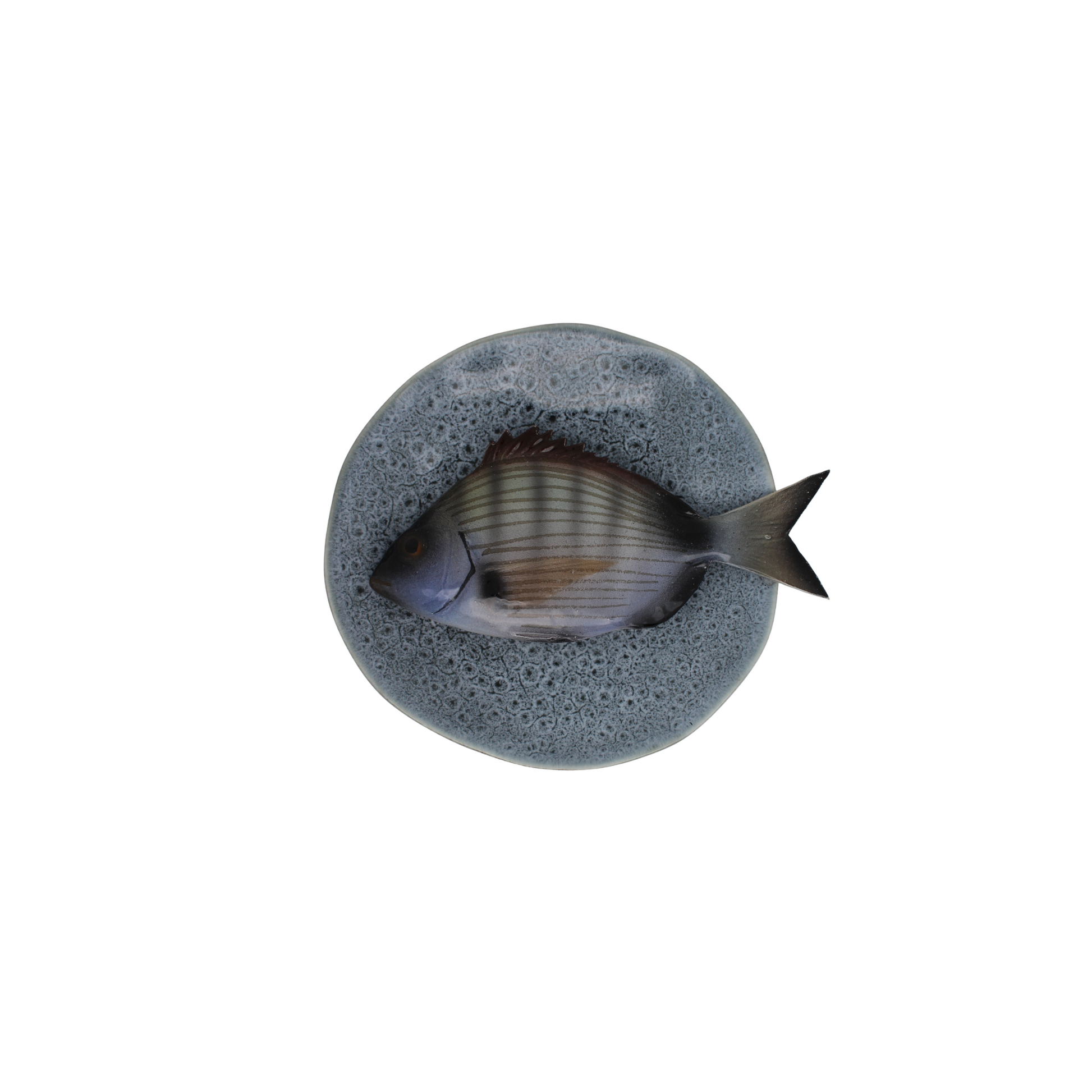 Sarago medio op blauw/grijs bewerkt bordje, 15 cm