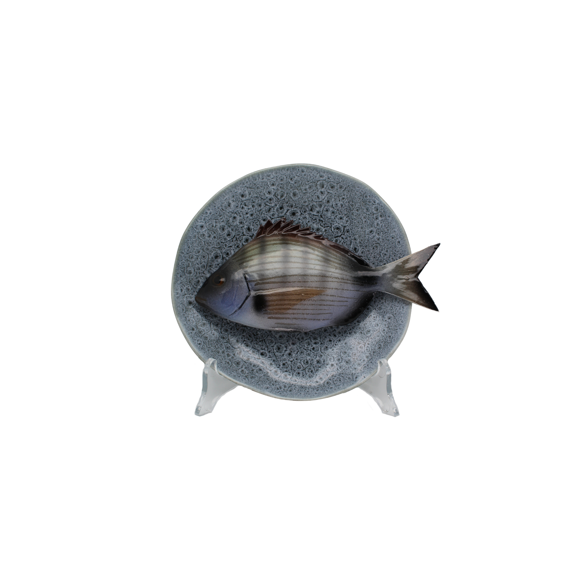Sarago medio op een blauw/grijs bordje, 15 cm rond. Aan de achterkant is een ophanghaakje bevestigd en kan direct aan de wand gehangen worden.