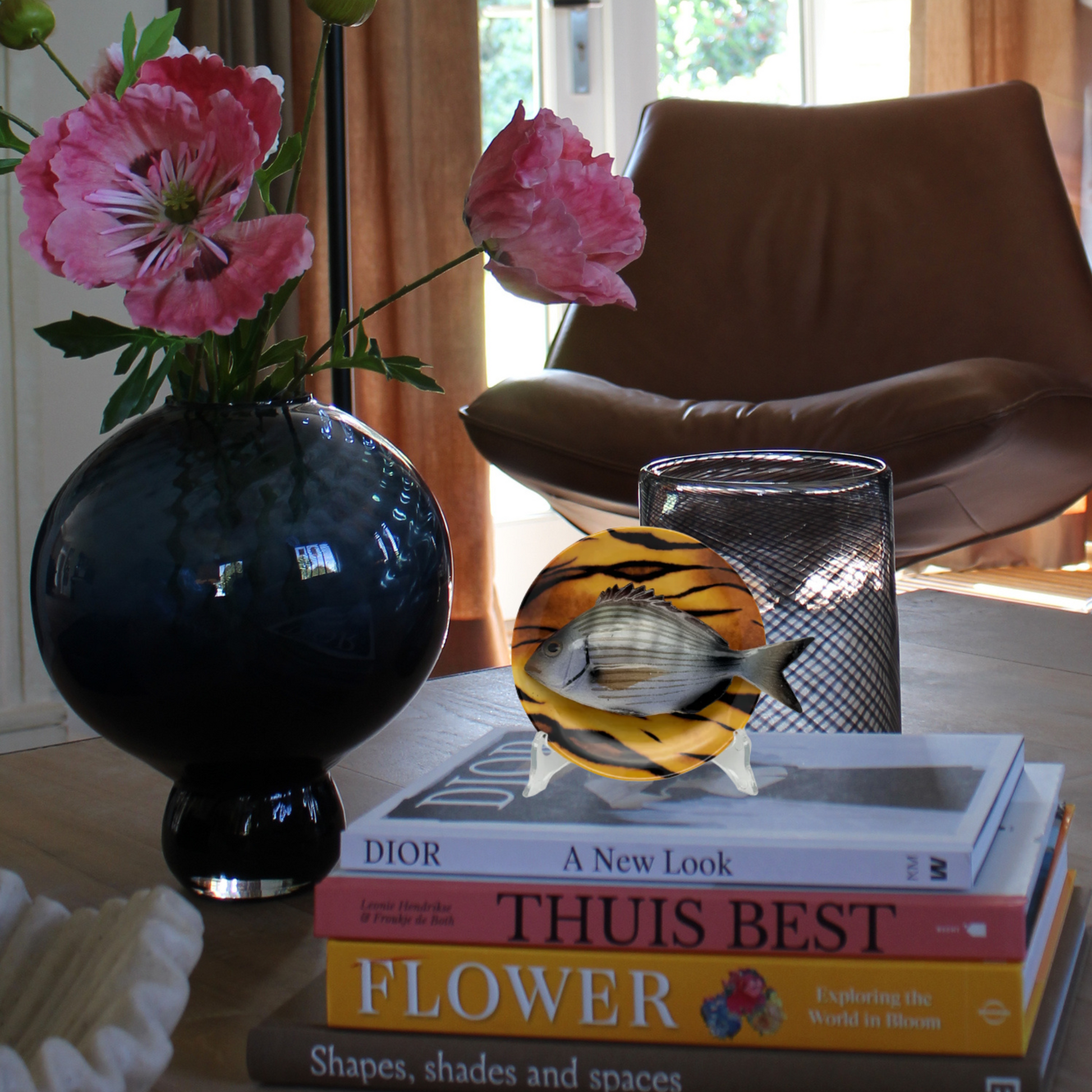 Sarago medio op tijger print bord, 14 cm rond. Aan de achterkant zit een ophanghaakje en kan direct aan de wand gehangen worden of op een borden standaard gezet worden.