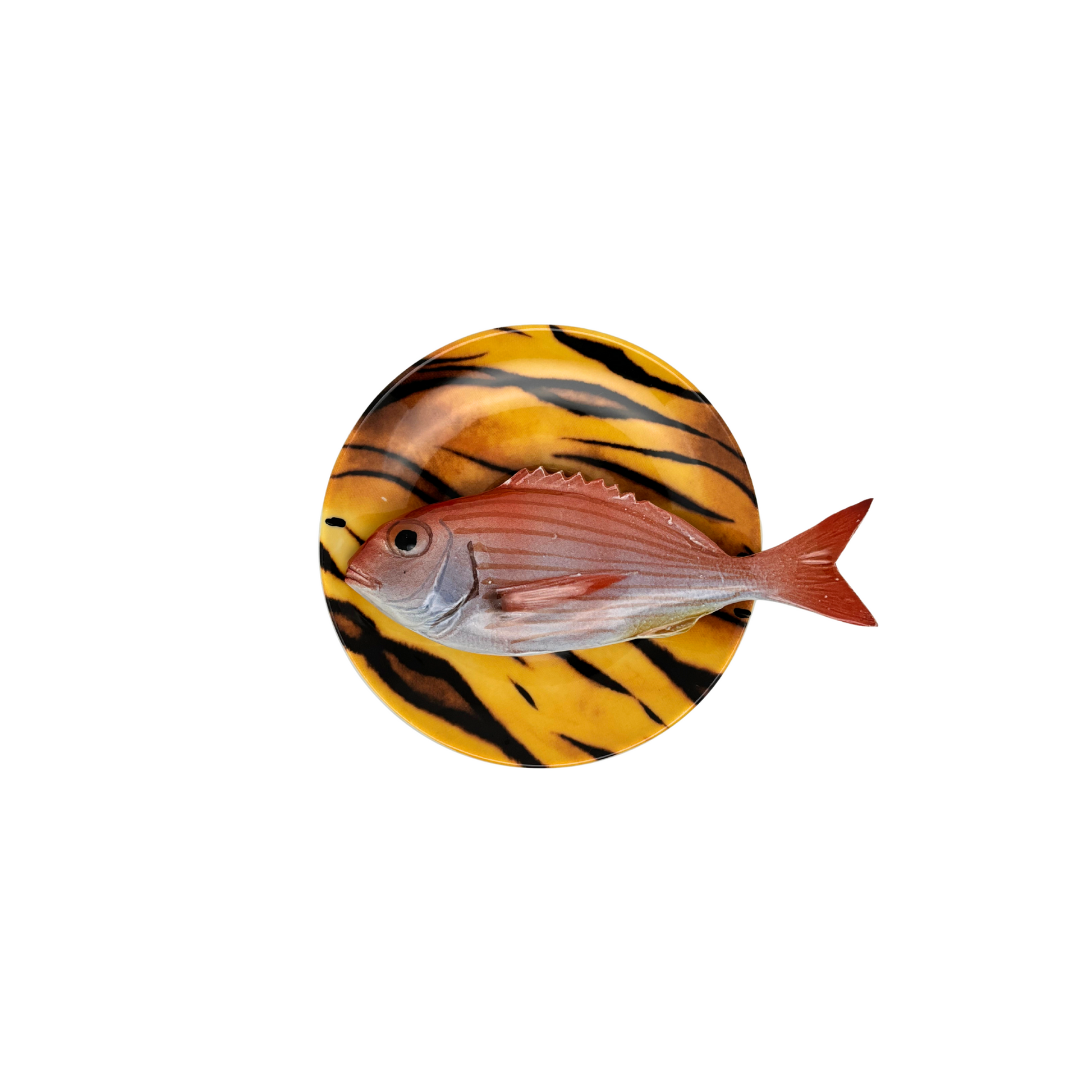 Pagello op tijger print bord, 14 cm rond. Aan de achterkant zit een ophanghaakje en kan direct aan de wand gehangen worden of op een borden standaard gezet worden.