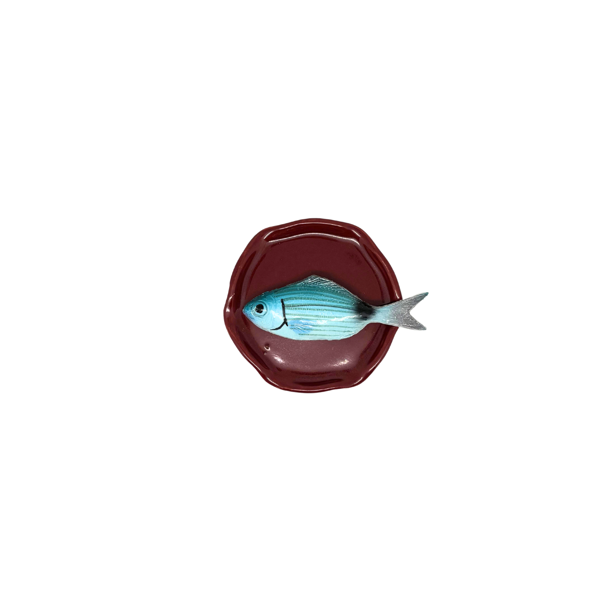 Occhiata piccolo op handmade bordeauxrood bordje, 11 cm, aan de achterkant zit een haakje bevestigd en kan direct aan de wand gehangen worden of op een bordenstandaard gezet worden.
