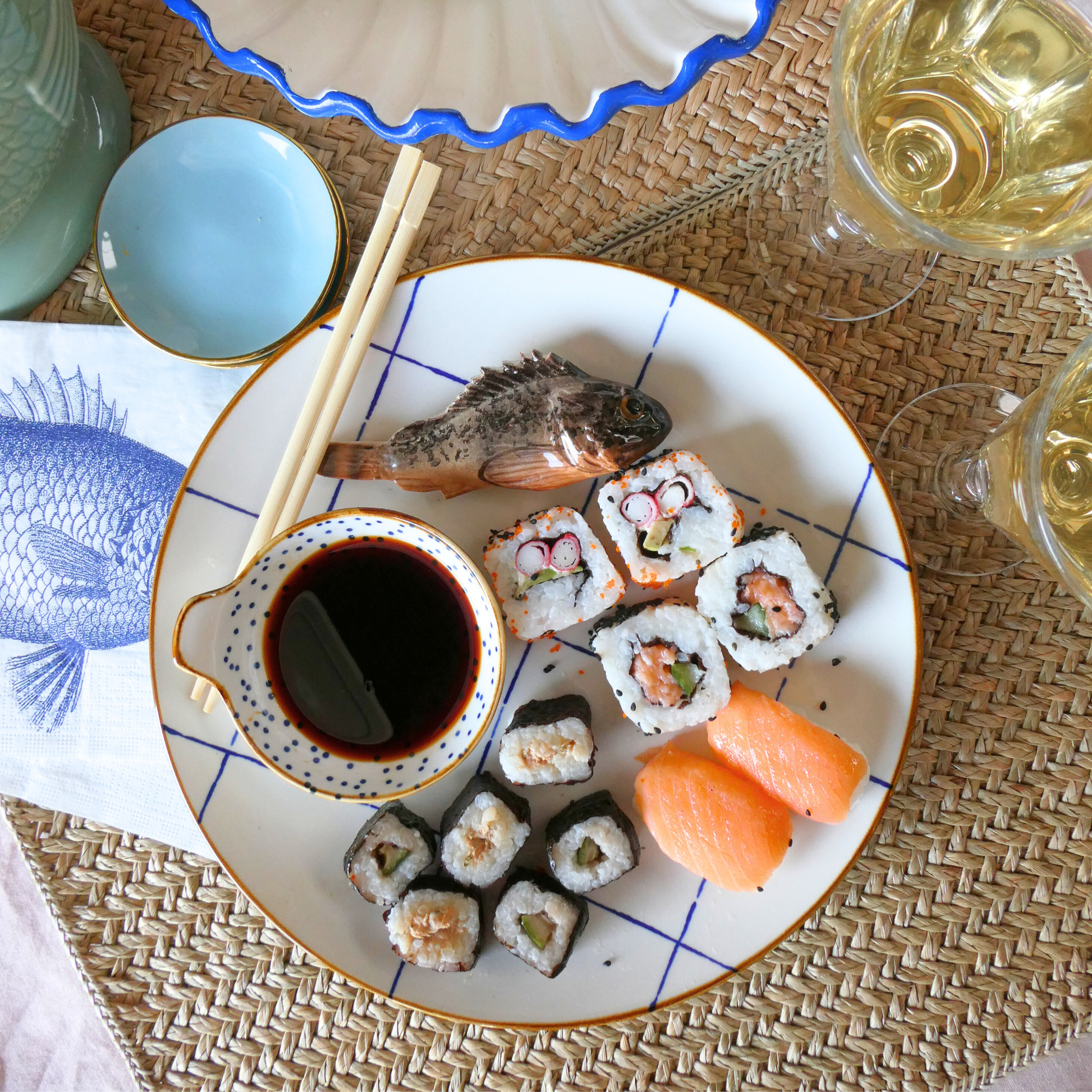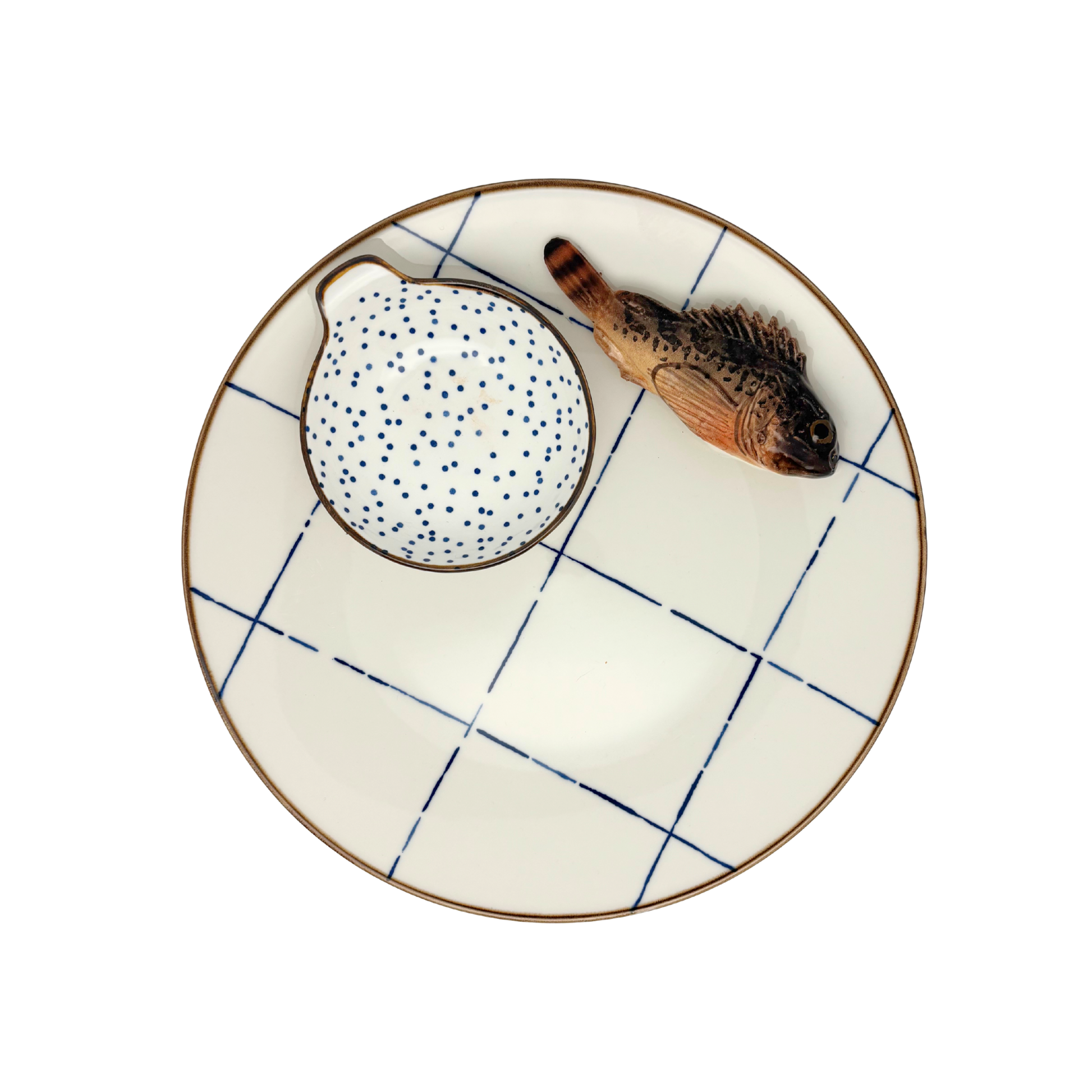 Een speels borrelbord met de Scorfano Marrone en een dipbakje die subtiel op het bord zijn bevestigd. Het lichte bord met subtiel blauw ruitpatroon en dipbakje met kleine stippen geven een frisse, maritieme uitstraling en maakt dit serviesstuk een echte blikvanger op tafel.
