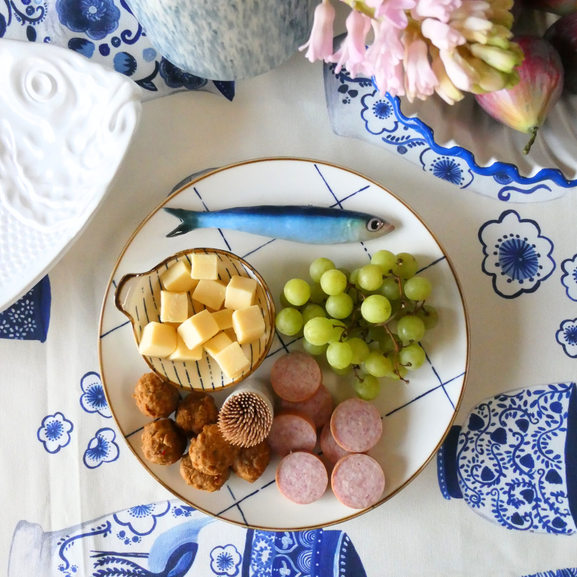 Een speels borrelbord met de Sardine medio en een dipbakje die subtiel op het bord zijn bevestigd. Het lichte bord met subtiel blauw ruitpatroon en het gestreepte dipbakje geven een frisse, maritieme uitstraling en maakt dit serviesstuk een echte blikvanger op tafel.