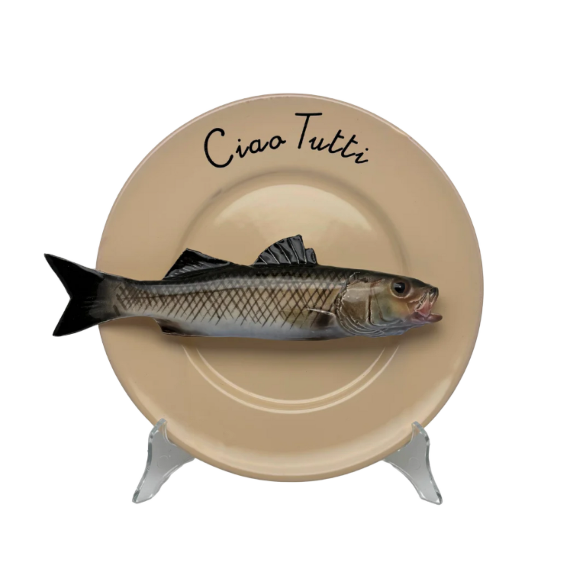 Spigola op camel/zand kleur bord "Ciao Tutti", 23 cm rond